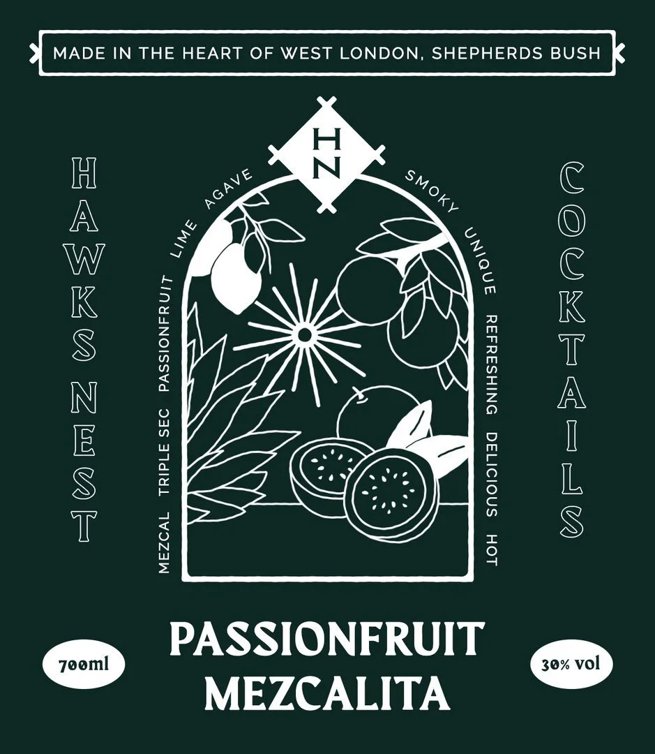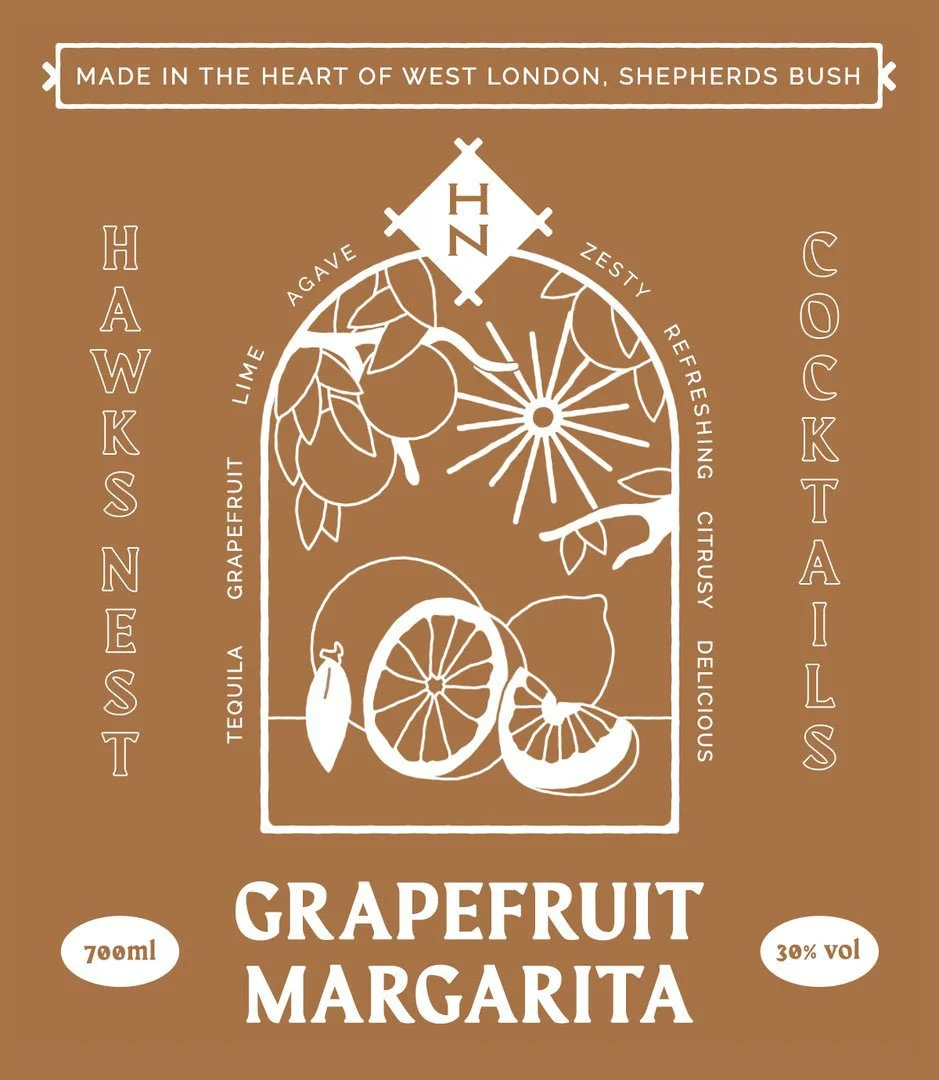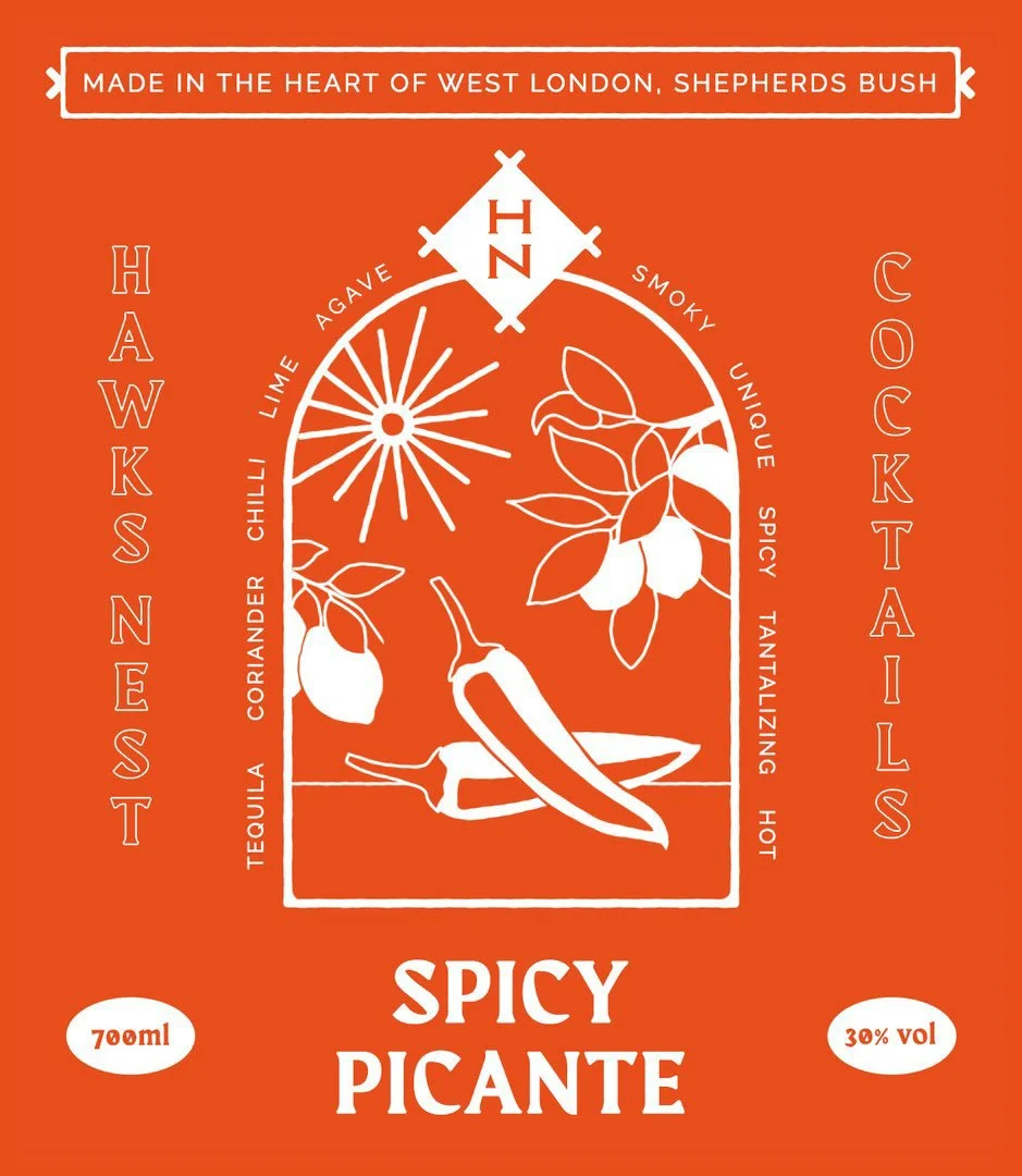 I had the pleasure of working with a popular Bar and Restaurant situated in Shepherd's Bush Market, The Hawk’s Nest, to create a series of statement labels for their takeaway margarita range. I wanted the designs to be bold, illustrative and descriptive to give the consumer a flavour of the beverage before purchase, showcasing the ingredients to convey the passion and care which goes into every bottle. They each have their own signature colour, which compliments the tones of the drinks themselves, whilst still maintaining a cohesive family resemblance.